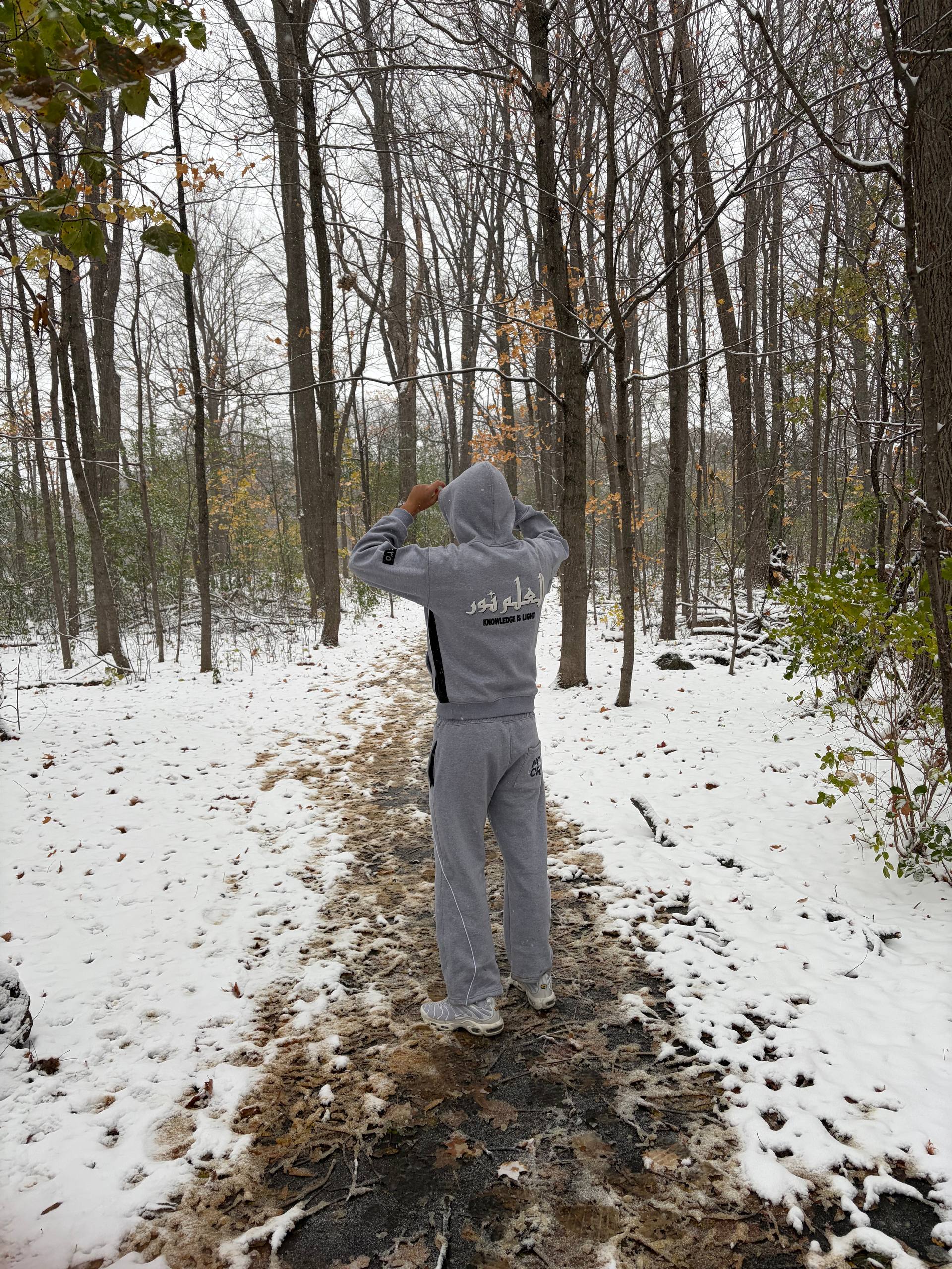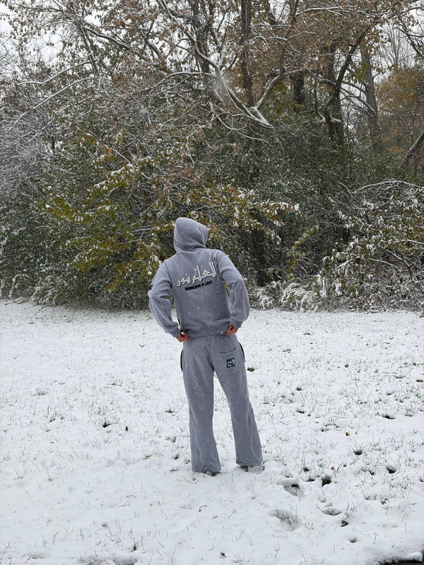 A relaxed-fit gray tracksuit from our Knowledge is Light drop. Features puff print Arabic calligraphy, a hidden sleeve message (24:35), and premium cotton comfort. Where faith meets fashion.